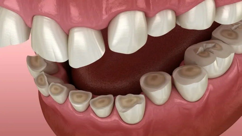 - Flattened, chipped, or worn teeth